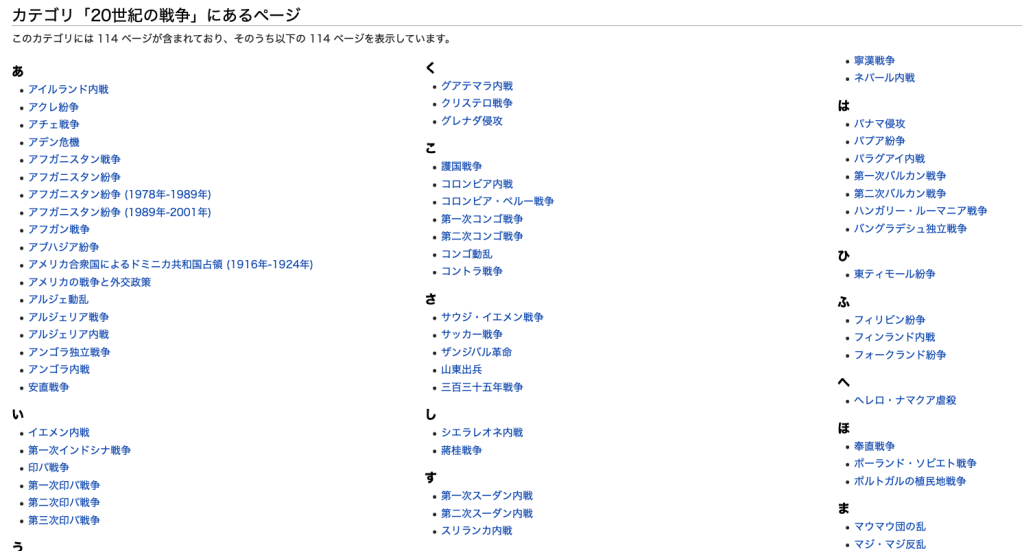20世紀のリストを見ると、目が回るくらいの数の項目が並んでいる。https://ja.wikipedia.org/wiki/Category:20世紀の戦争