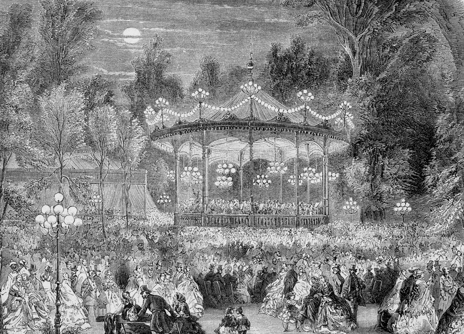 Je ne puis jamais m’empêcher de jeter un regard, sinon universellement sympathique, au moins curieux, sur la foule de parias qui se pressent autour de l’enceinte d’un concert public. L’orchestre jette à travers la nuit des chants de fête, de triomphe ou de volupté. Les robes traînent en miroitant ; les regards se croisent ; les oisifs, fatigués de n’avoir rien fait, se dandinent, feignant de déguster indolemment la musique. Ici rien que de riche, d’heureux ; rien qui ne respire et n’inspire l’insouciance et le plaisir de se laisser vivre ; rien, excepté l’aspect de cette tourbe qui s’appuie là-bas sur la barrière extérieure, attrapant gratis, au gré du vent, un lambeau de musique, et regardant l’étincelante fournaise intérieure.