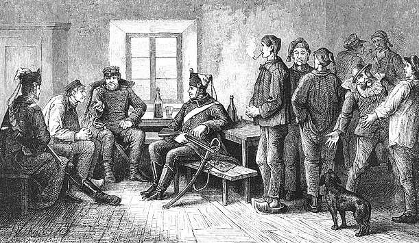 言葉が聞き慣れないのはドイツ語だからで、勝ち誇った男たちはプロシアの兵隊。彼らが町を占領し、戦争に敗れたフランス人たちは、家の中で息を潜め、荒涼とした外の様子を窺っている。
