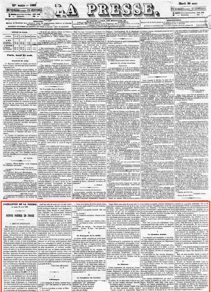 1862年9月、「ラ・プレス」という新聞に3回シリーズで「小散文詩」集が掲載される。その中に、「朝の一時」がある。その詩は、この上もなく赤裸々な言葉で綴られる詩人の内心の独白。