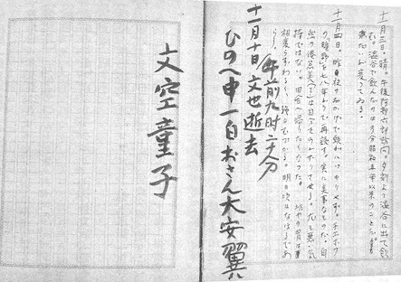日記には、「午前9時20分/文也逝去」と太い大きな文字で書かれ、その後に戒名の「文空童子」と書き加えられている。