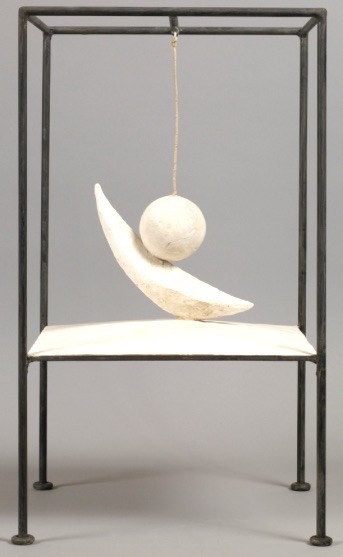 アルベルト・ジャコメッティの「吊るされた球」は、四角い枠組みの中にクロワッサンと丸い玉が吊されたもの。