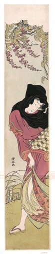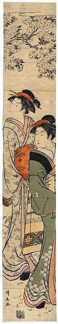 鳥居清長の「藤下の風邪に悩む美人図」(下左)や「桜下美人図」(下中)では、女性の体が画面の中に収まっていない。