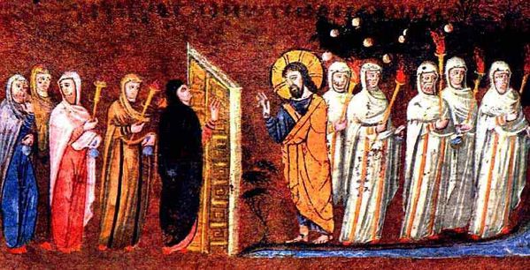 愚かな乙女たちは、ランプのオイルを準備せず、夫(l’époux)が到着した時、ランプに火を灯すことができない。そのために、彼女たちの前で式場の扉が閉ざされてしまい、中に入ることができない。