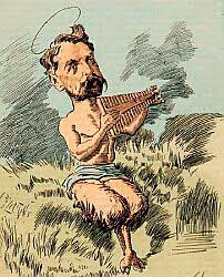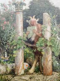 牧神は葦笛に息を吹き込み、音楽を奏でる。
