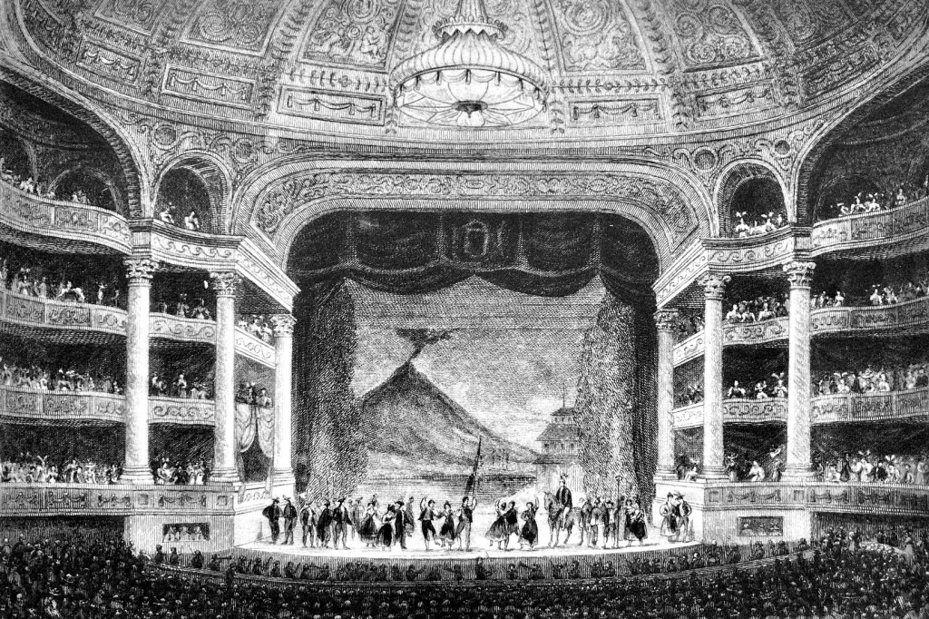1828年には、パリのオペラ座で、スクリーブ作の「ポルティチの物言わぬ娘(La Muette de Portici)」が上演され、ナポリ近郊にあったポリティチをヴェスヴィオ山の噴火が襲う様子が、観客たちの目の前に描き出された。