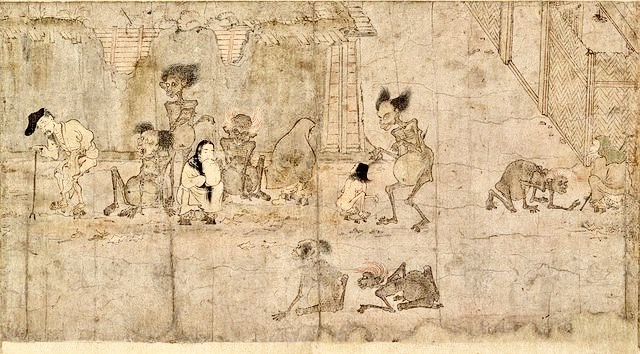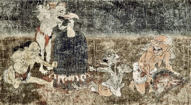 様々な悪行によって地獄に落ちた人々や飢餓に苦しむ人々の描かれた絵画は、優美な宮廷の貴族たちを描いた絵巻とは正反対の印象を与える。