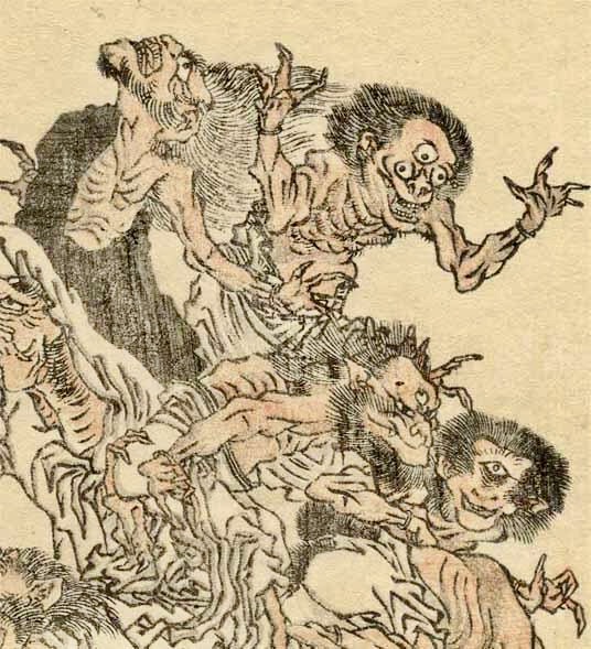 髪を抜かれている女の生前の行為に関しては、『今昔物語』に収められている「太刀帯(たてわき=警備の役人)の詰め所で魚を売っていた老婆の話」から取られたもので、蛇を魚だと偽って売っていたエピソードが語られる。