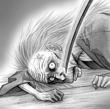さらに近くに寄ると、火を灯した木切れを手に持ち、一つの死骸を覗き込む老婆の姿が見える。