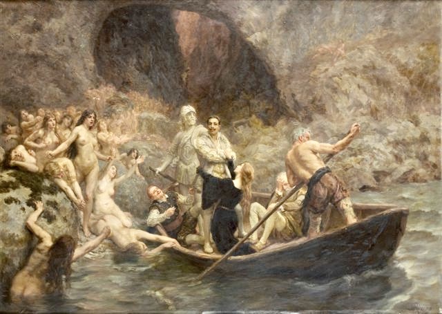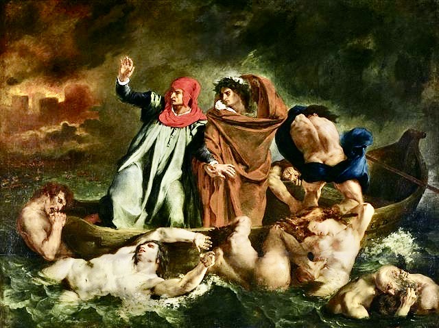 画家が描いたのは、『神曲』(地獄篇第8歌)の中で、ダンテがヴェルギリウスに導かれ、地獄の河を小舟で下っていく場面。