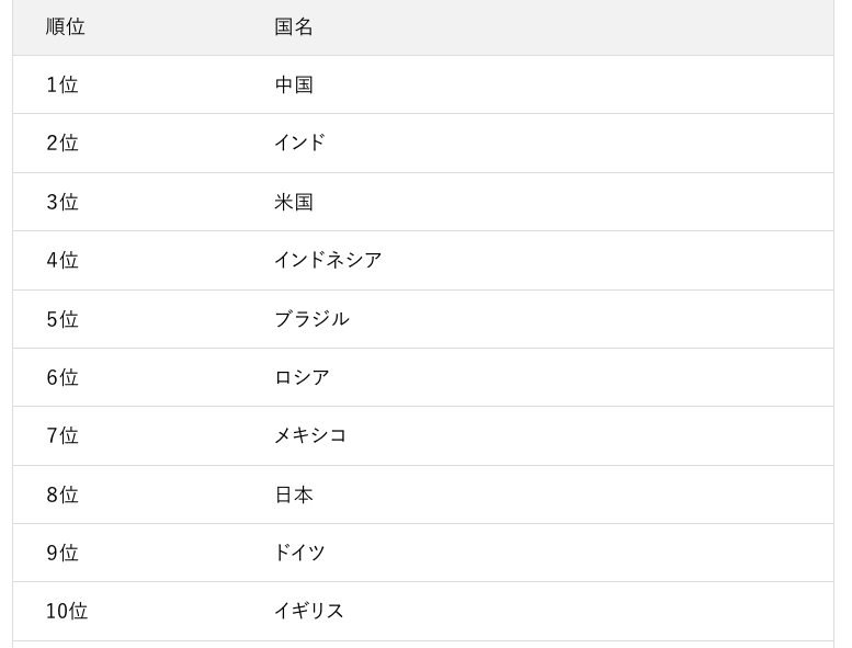 2050年になると、GDPのトップが中国になるだけではなく、インド、ブラジル、ロシア、メキシコなどの経済力が上がり、現在のようにG7を中心とした西側諸国の経済が世界の中心を占める世界情勢は大きく塗り替えられるものと考えられる。