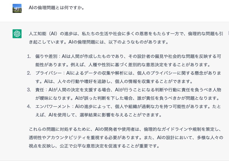 まず、ChatGPTにAIの倫理問題とは何か、日本語で質問してみた。