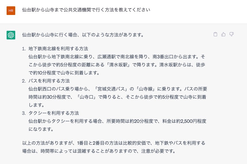 仙台駅から芭蕉の俳句で有名な立石寺(山寺)に行く方法をChatGPTに質問してみると、以下の提案があった。