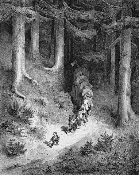親指小僧は、他の6人の兄弟とともに両親に森の奥に連れて行かれ、そこに取り残される。