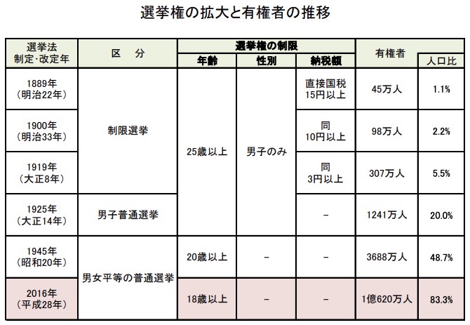 日本で最初に選挙制度が制定された1889(明治22)年には、税金を15円以上収めていることが条件であり、人口の約1%がその条件を満たし、選挙権を有した。