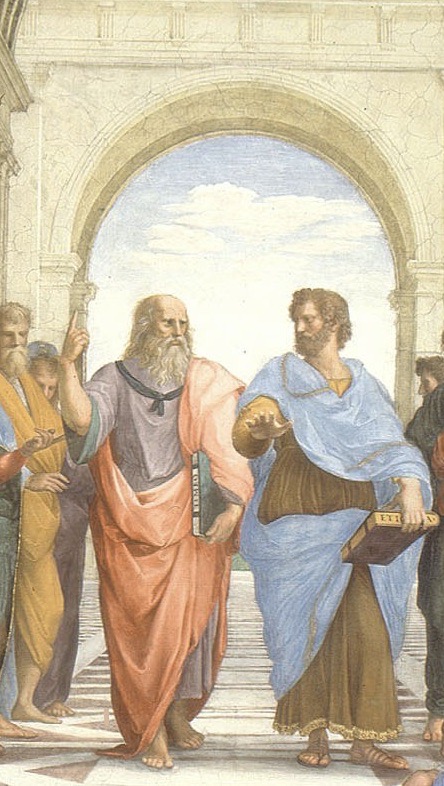 ラファエロによって描かれた「アテネの学堂」の中で、プラトンは天上を指指し、アリストテレスは並行方向に指を向けている。