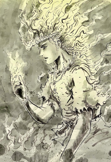 Ensuite, les noms de ceux qui, de ses excréments, devenaient des divinités, étaient Hani- Yasu-Biko-no-kami, puis Hani-Yasu-Bimé-no-kami. Ensuite, les noms de ceux qui, de son urine, devenaient des divinités, étaient Mitsu-hanomé-no-kami, puis Waku-musubi-no-kami. L’enfant de celle-ci s’appelait Toyo-Uké-Bimé-no-kami. Izanami mourut à cause de l’accouchement de la divinité du Feu.
