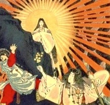 La belle femme éternelle suggère la Grande Déesse du Soleil, qui est nommée en général Amaterasu, et, dans le Nihon-shoki (Chroniques du Japon), au moment de sa naissance, elle est appelée Oo-Hirumé-no-muchi.