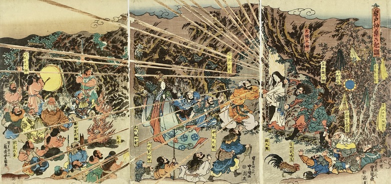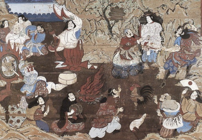 Ces bacchanales japonaises (n.8) apparurent, en ondulant comme un mirage, devant Organtino stupéfait. Il vit, à la lumière de feu, des Japonais vêtus à l’antiquité, se boire du saké, assis en rond. Juste au milieu d’eux, il vit une femme, une femme grandiose qu’on n’avait jamais vue au Japon, danser frénétiquement sur un seau retourné. Derrière le seau il vit un homme aussi robuste planter paisiblement une branche sacrée, arrachée avec des racines et suspendue de trésors et de miroirs. Autour d’eux il vit des centaines de coqs pousser sans cesse des chants gaillardement, en se frottant les plumes et les crêtes. Au-delà, – Organtino ne pouvait pas encore s’empêcher de douter de ses yeux – au delà des brouillards nocturnes, un rocher comme une porte de la grotte se tenait debout dans une posture imposante.