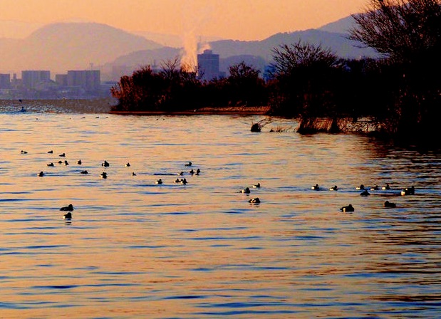 近江(あふみ)の海(み) 夕波千鳥(ゆふなみちどり) 汝(な)が鳴けば 心もしのに 古(いにしへ)思ほゆ (柿本人麻呂)