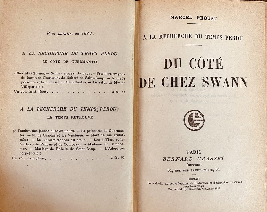 1913年、グラッセ社がプルーストの自費という契約で出版を引き受け、『失われた時を求めて』の第1編『スワン家のほうへ』が刊行される。