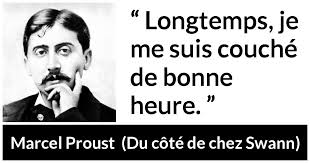 長い間ずっと、私は、早い時間に床につくのが常だった。ロウソクが消えるとすぐに目が閉じ、「今眠ろうとしている」と思う時間さえない時もあった。30分くらいしてから、今眠ろうとしているのだという考えが、私を目覚めさせた。手に持っていると思い込んでいる本を置き、ロウソクを消そうと思ったりした。眠りながら、先ほどまで読んでいたことを考え続けていたのだっだ。そんな時に色々と考えることは、少し独特だった。私自身が、本の内容、例えば、一つの教会、一曲の四重奏曲、フランソワ1世とカール5世の対立になったかのように思われた。そうした思いは、目が覚めてからも数秒間続いた。それが私の理性にショックを与えることはなかったが、しかし、目の上でうろこのような重しになり、ロウソクの火がもうついていないことを、目が認識するのを妨げた。次に、その考えが私にとって理解不可能になり始めたのだが、それはちょうど、生まれ変わった後、前生の様々な考えが理解不可能になるのと同じことだった。本の主題が私から離れ、私がそれに熱中するもしないも自由だった。そして、視力を取り戻すとすぐに、自分の回りに闇が広がっていることに驚いた。その闇は穏やかで目に優しいものだったが、しかし、精神にとってはたぶんそれ以上のものだった。というのも、それは精神にとって、原因もなく、理解ができないもの、本当に真っ暗なもののように見えたのだった。今何時だろうと自問した。汽車の汽笛が聞こえたのだが、その音は、少し離れたところから、森の中の一羽の鳥の鳴き声のように聞こえ、距離がひらいていくにつれ、荒野の広がりを感じさせた。その中を、旅人が、次の駅へと急いで向かっていくのだ。今たどっている小道は、旅人の記憶の中に刻み込まれることになるだろう。それほど、興奮していたのだ。新しい場所に。いつもとは違う行動に。少し前にした会話に。見知らぬ街灯の下での別れの挨拶に。その挨拶は夜の静けさの中でまだ彼についてきている。そして、もうじき故郷に戻る時に感じるはずの穏やかな気持ちに。(『スワン家の方へ』)