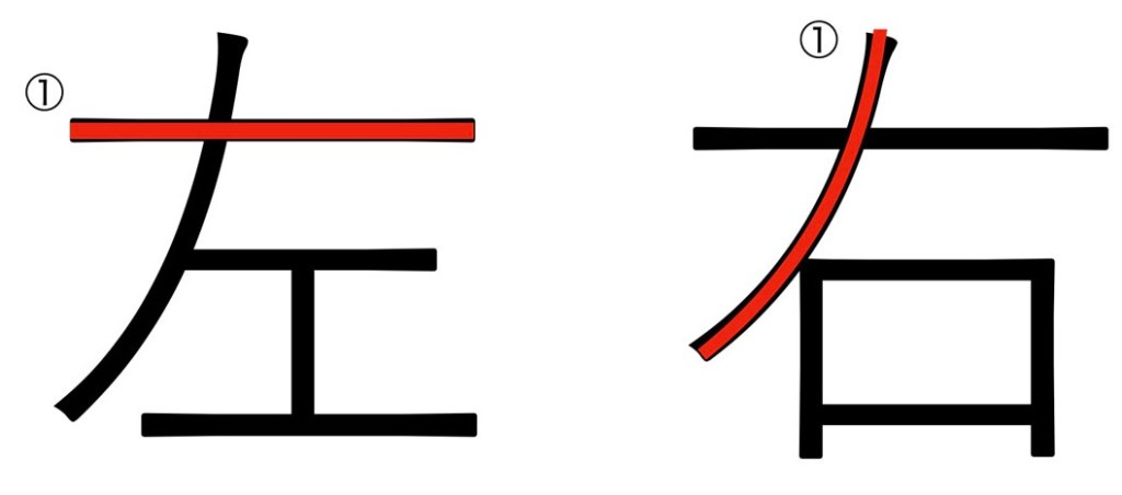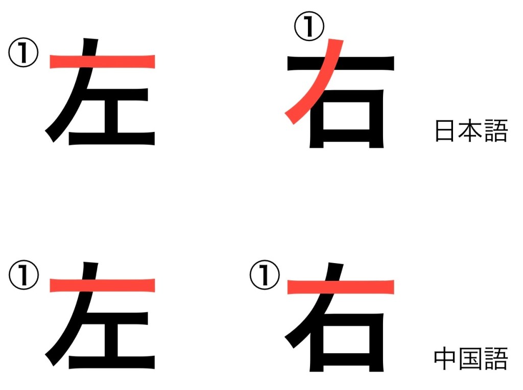 日本の書き順では、「左」では横線から書き始め、「右」は払いが最初になるとされている。