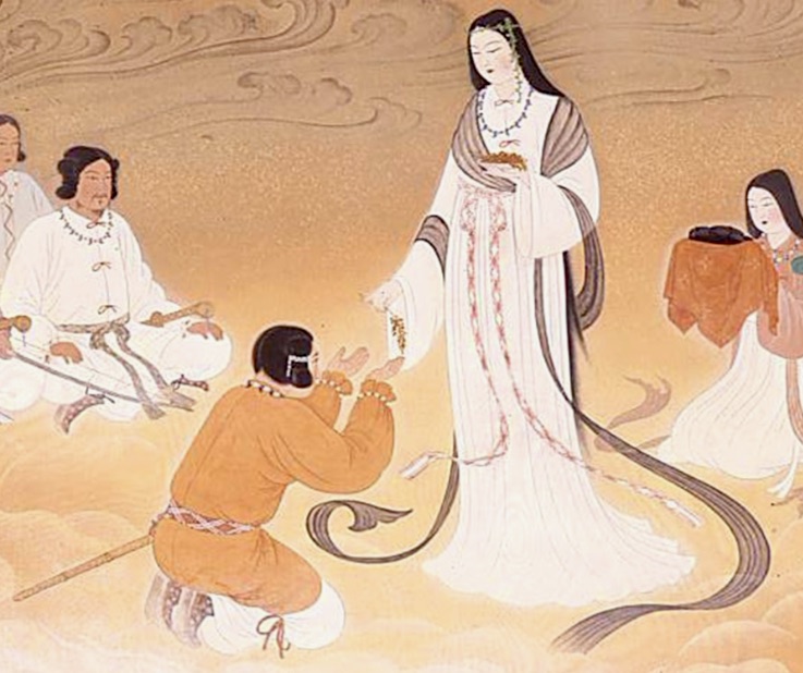 『日本書紀』には、天照大御神(あまてらすおおみかみ)が、孫の邇邇芸命(ににぎのみこと)に、三種の神器とともに、稲穂を授け、地上に降臨させたという記述がある。