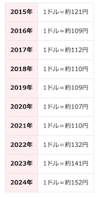 この一覧表を見ると、2022年から円が急激に、しかも極端に安くなったことがわかる。2021年から見ると、147円は考えられない円安なのだ。