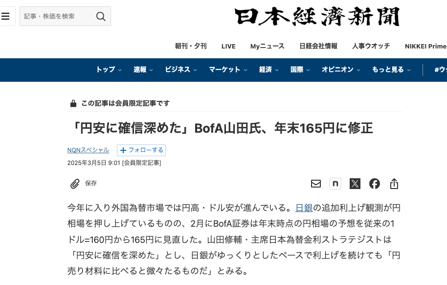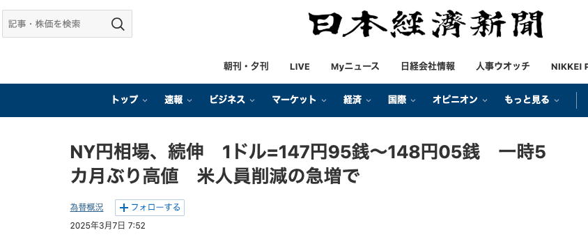 2025年3月7日の日経新聞に”円高”という記事が見られる。