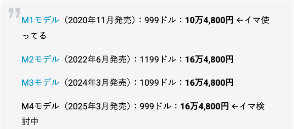 2020年にM1のmacbook airが発売された時、ドル・ベースでは999ドル。