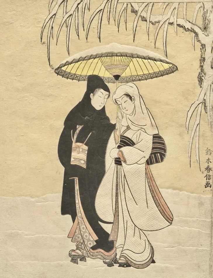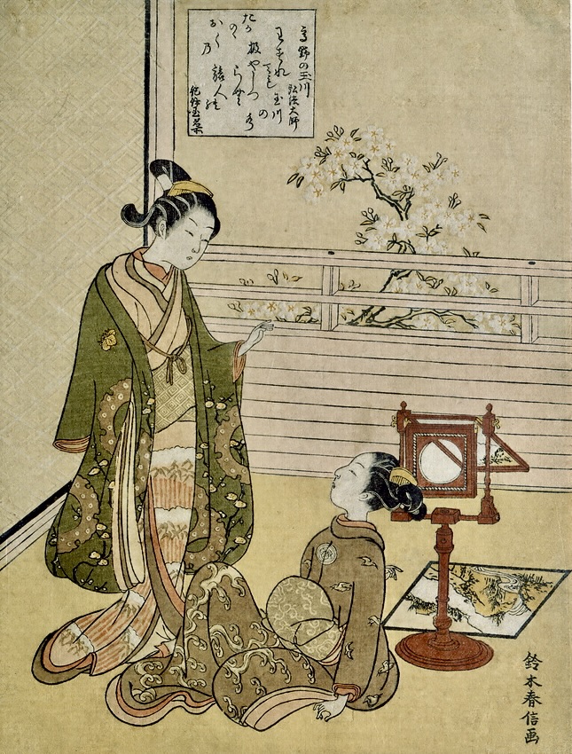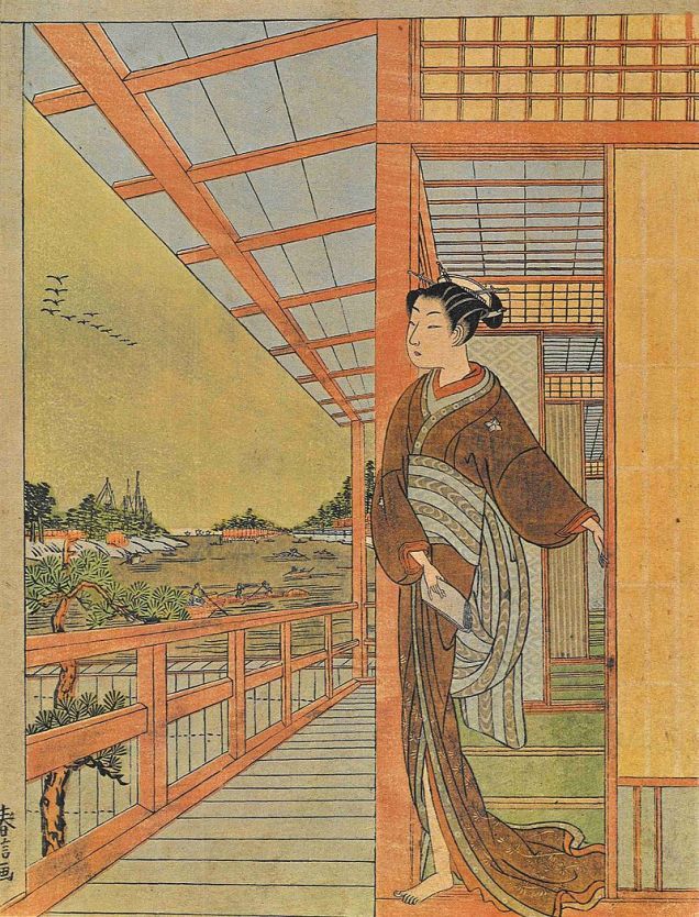 錦絵の第一人者と言われる鈴木春信は、多色刷りのメリットを十分に活かし、繊細で優美な筆の運びと洗練された色使いを駆使して、以前の浮世絵よりもリアルさを感じさせる作品を仕上げている。
