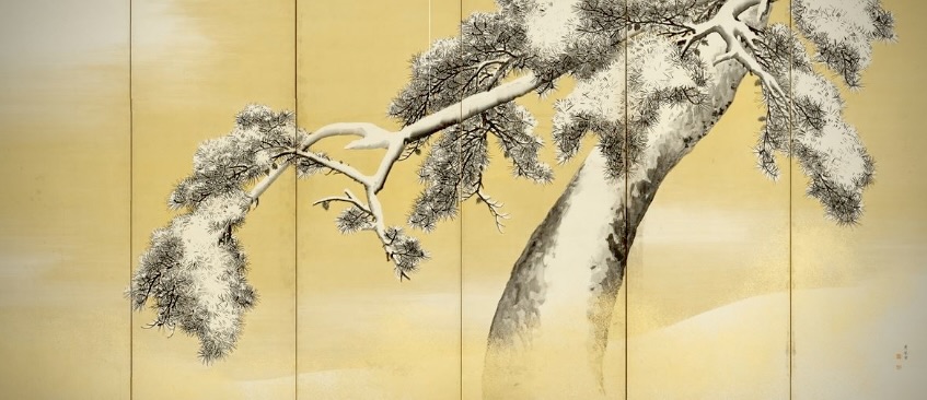 「雪松図屏風」(右隻)でも、金色の地の上に描かれた巨大な松や、松に降りかかる雪が雄大な光景を作り出し、安土桃山時代以来の屏風画の伝統を継いだことが明らかである。しかし、木の枝や葉の詳細な描写は写実的であり、装飾的でありながらも同時にリアルな表現を実現している。