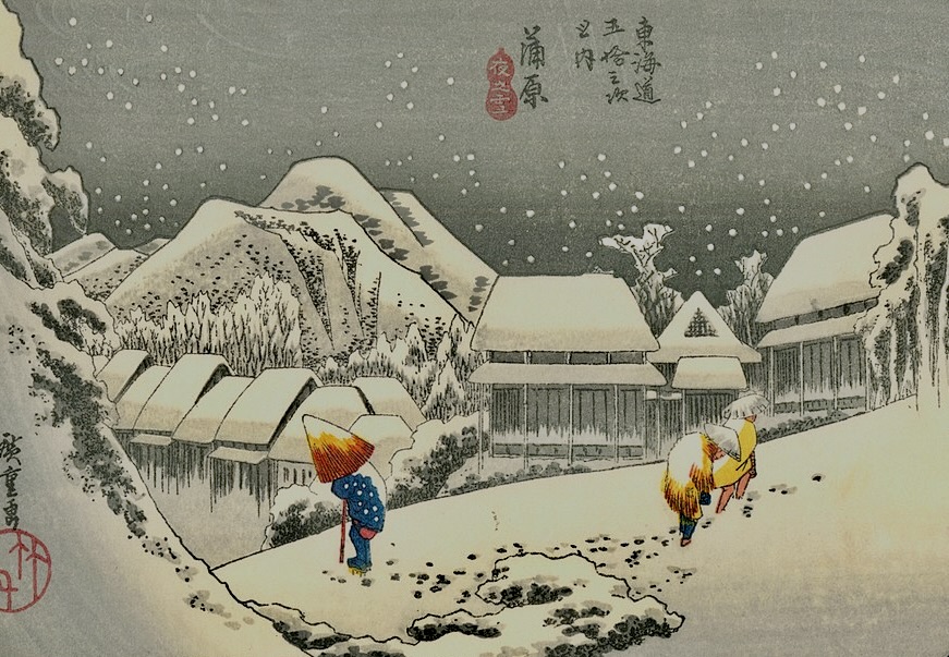 「東海道五十三次 蒲原」では、穏やかな構図の中で、しんしんと降る雪が積もる情景が、白と黒を主体にしたモノトーンの基調で絶妙に描かれている。この作品からは、ただの風景画にとどまらず、心象風景のような深い感情が浮かび上がり、静かながらも豊かな情緒を感じさせる。