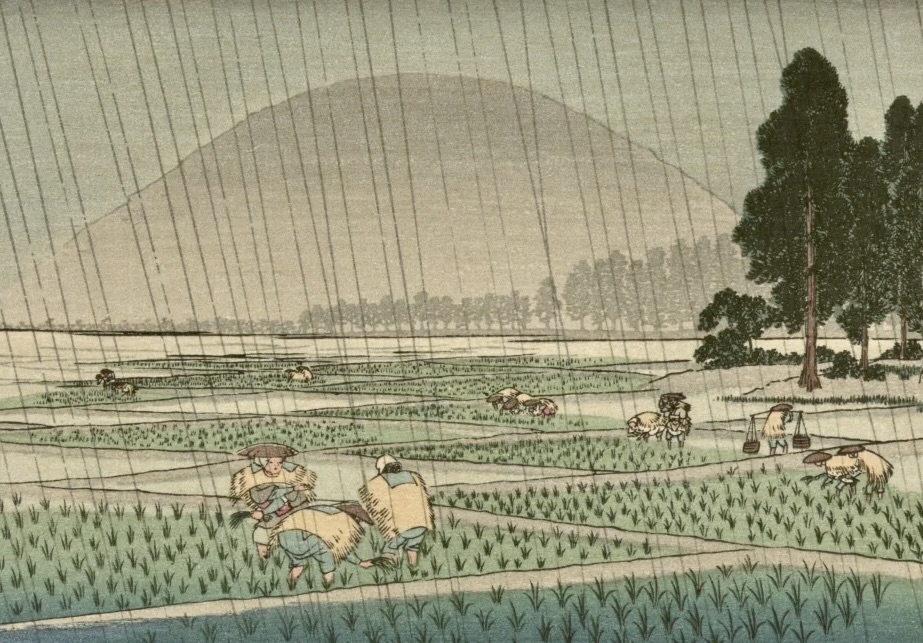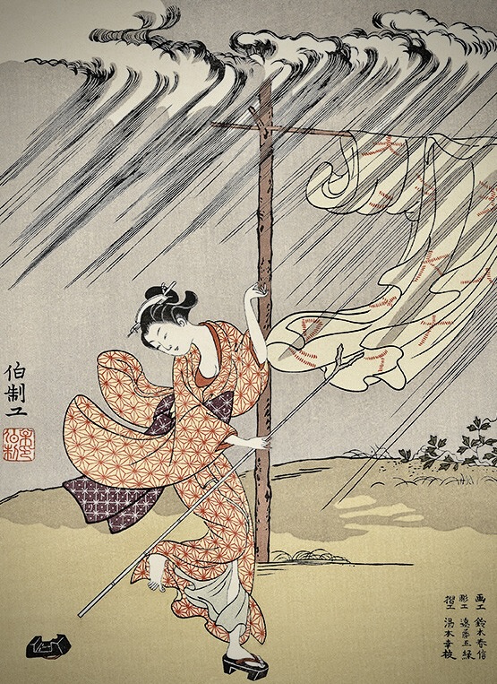 「夕立」はその代表的な例であり、突きつける強い風がさまざまな線で描かれ、女性の着物の裾や洗濯物が風に吹かれて巻き上がる様子、そして画面の奥に置かれた小さな草などによって、リアルな一面を持つ浮世絵になっている。
