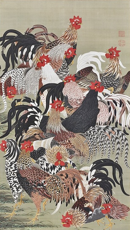 伊藤若冲の絵画は、装飾性と写実性が融合し、現代のグラフィックアートのような濃厚な色使いで動植物が描かれているが、細部には徹底したこだわりが見られる。