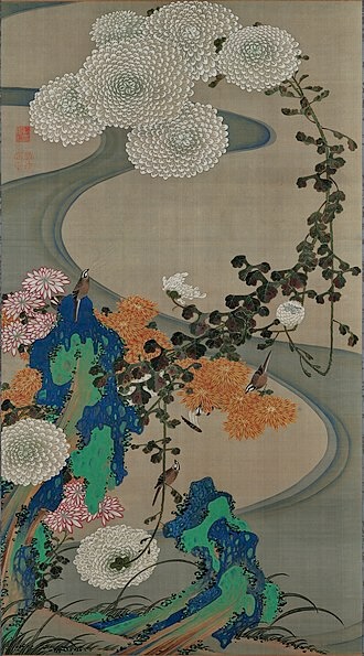 《動植綵絵》に収められた「群鶏図」と「菊花流水図」を見れば、デザイン画のようでありながら、細部まで精密に描かれ、すべてに生命感が宿っていることが感じられる。