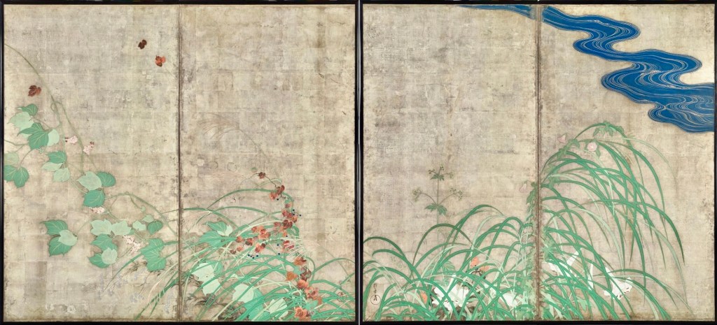 これらの草花が写実的で、自然に生える草葉を思わせることは、尾形光琳の「燕子花図」などと比較するとよくわかる。