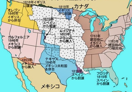 また、1846年にはイギリスとの交渉によりオレゴンの南半分を獲得し、同年に始まったメキシコとの戦争に勝利して、1848年にはカリフォルニアを1500万ドルでメキシコから割譲させるなど、領土を太平洋岸にまで拡大した。