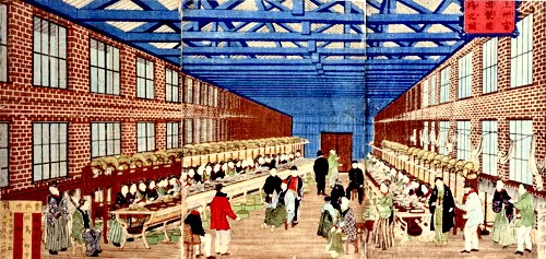 例えば、日本製生糸の増産を目指して官営製糸場を建設するにあたり、フランス人技術者を雇用し、フランスの技術を導入した富岡製糸場が1872年に創業を開始した。