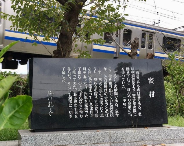 暮色を帯びた町はづれの踏切りと、小鳥のように声を挙げた三人の子供たちと、そうしてその上に乱落(らんらく)する鮮(あざやか)な蜜柑の色と ーー すべては汽車の窓の外に、瞬(またた)く暇もなく通り過ぎた。が、私の心の上には、切ない程はっきりと、この光景が焼きつけられた。(「蜜柑」)