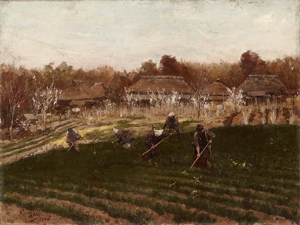 浅井忠はフォンタネージのよるバルビゾン派的な作風を最もよく伝える画家といってもよく、1889(明治22)年に設立された「明治美術会」の中心メンバーでもあった。