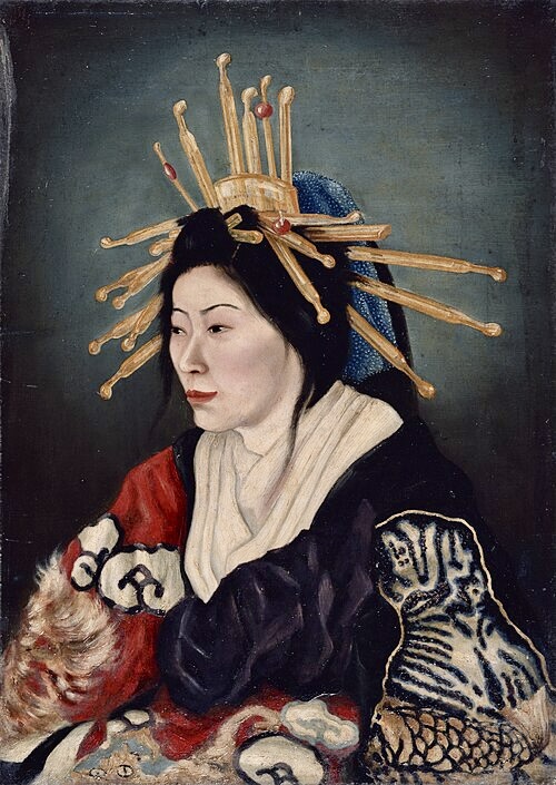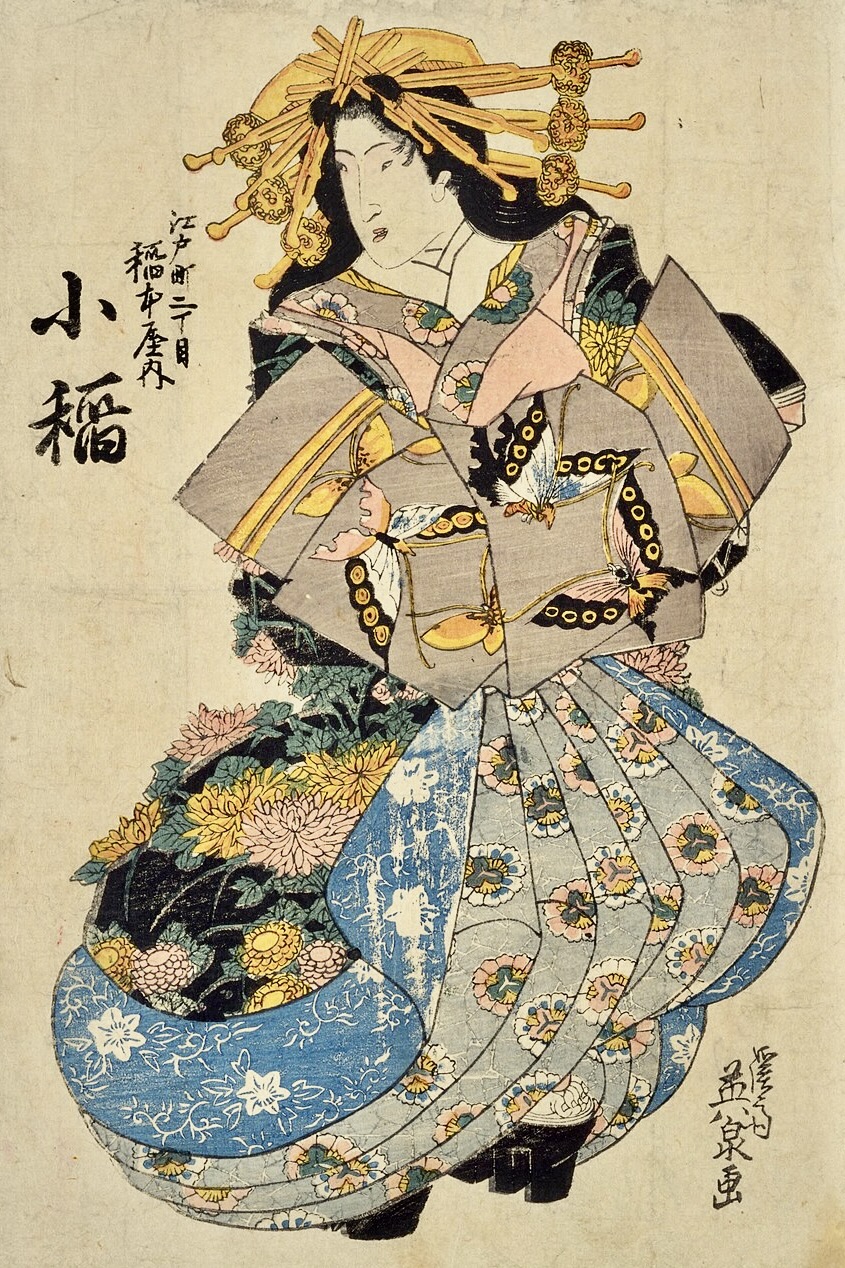 この「花魁」(おいらん)に描かれた女性は、吉原の四代目・小稲だといわれている。当時、多くの花魁たちは、例えば渓斎英泉(けいさい えいせん)のような浮世絵に描かれることを望んだのだが、彼女は油絵に描かれることを受け入れた。しかし、実際に描かれた自らの姿を見て、「わちきはこんな顔ではありんせん」と言い、泣いて怒ったという逸話が残されている。