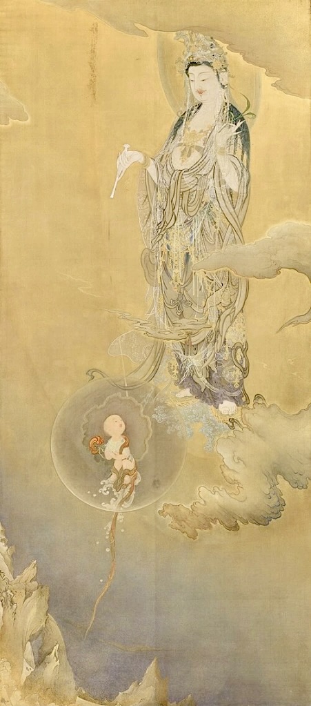 日本の顔料を用い、モノトーンの色調で落ち着いた雰囲気を醸し出している「悲母観音」になると、「仁王捉鬼図」で感じたような違和感はかなり和らいでいる。