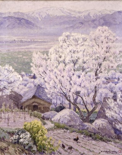 油彩画の「杏花の村」と水彩画の「境内の桜」では、微細で穏やかな花の様子が共通している。