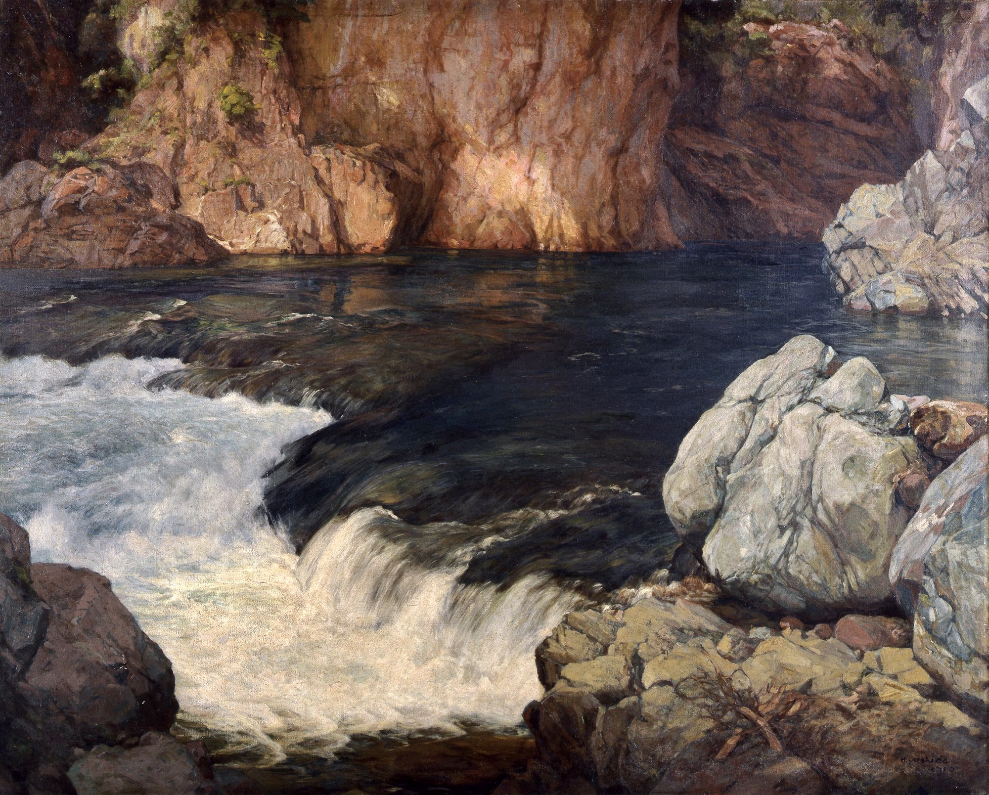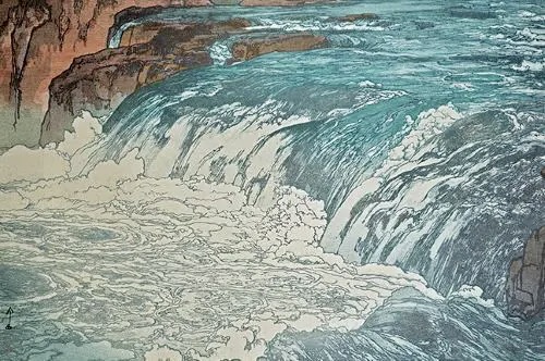 「渓流」と題され、ほぼ同じ構図が用いられている油絵と木版画は、どちらも力強い水の流れが印象的である。