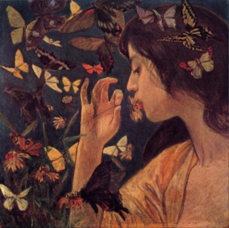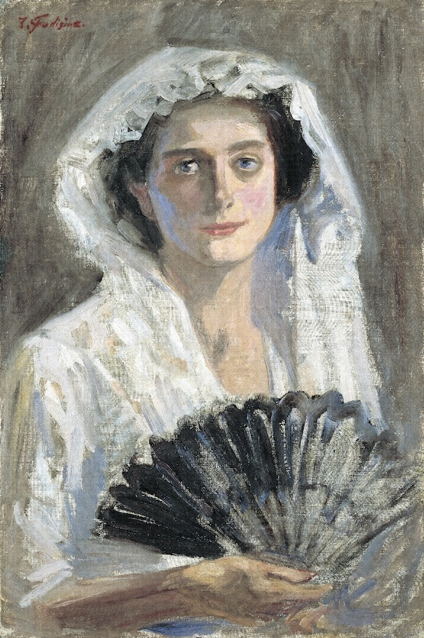 藤島武二は、パリに留学する以前にも「蝶」のような独自の雰囲気を持つ作品を描いていたが、留学中にイタリアで描かれた「黒扇」(こくせん)では、白の黒の明暗の対比や力強い筆触を活かし、より個性的なた作品を仕上げている。