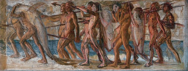 「海の幸」は、房総半島に滞在した際の体験に基づく、写実的な画題を扱っている。釣り上げたマグロを担いで行進する集団の姿は、生き生きとした現実味を帯びながらも、同時に、現実を超えた生命の躍動を感じさせもする。