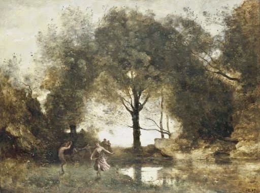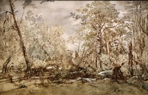 たとえば、テオドール・ルソーの「無垢なものたちの虐殺、あるいはロワシー島の伐採」(Le Massacre des Innocents ou Abattage d’arbres dans l’île de Croissy)では、画面中央に倒木が大きく描かれ、その両側には背の高い木々が立ち並ぶ。手前の木々は写実的に描かれ、背景に向かうにつれて空気遠近法が用いられ、輪郭は次第にぼやけていく。