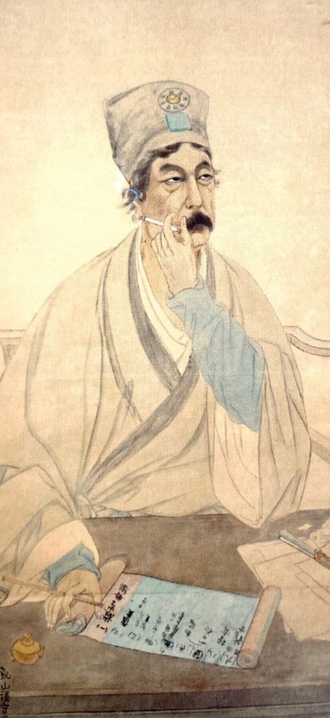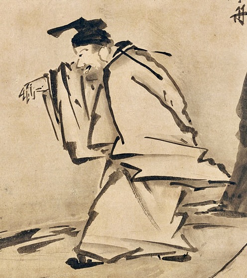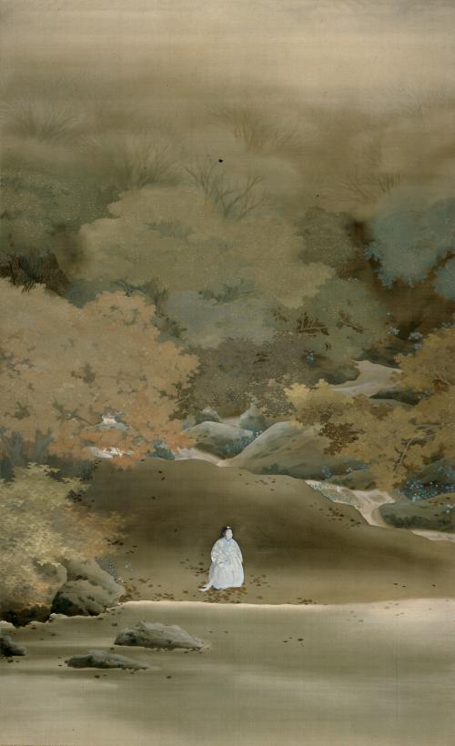 「屈原」に描かれた人物は、その画題の通り、屈原(くつげん)。彼は中国の戦国時代、楚の王に仕え、国家への忠誠と理想を追い求めたが、事敗れて追放され、放浪の末、最後は川に身を投げて自殺した。横山大観のこの絵のモデルになったのは、岡倉天心だと言われている。